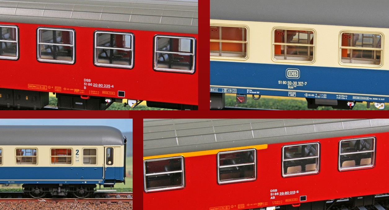 Set Nord West Express 236/237 „Hoek van Holland – København – Helsingør“, bestehend aus einem 1/2-Klasse-DSB Wagen, einem 2-Klasse-DSB-Wagen und einem Bcm246-DB-Liegewagen.
