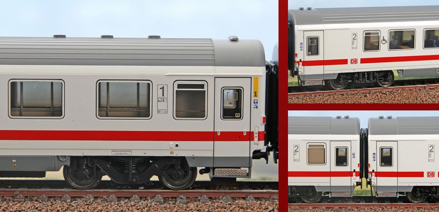Set Eurocity DB bestehend aus einem 1.-Klasse-Wagen und drei 2.-Klasse-Wagen in ICE-Lackierung mit den neuen Dienstpiktogrammen, davon eines für den Fahrradtransport.
