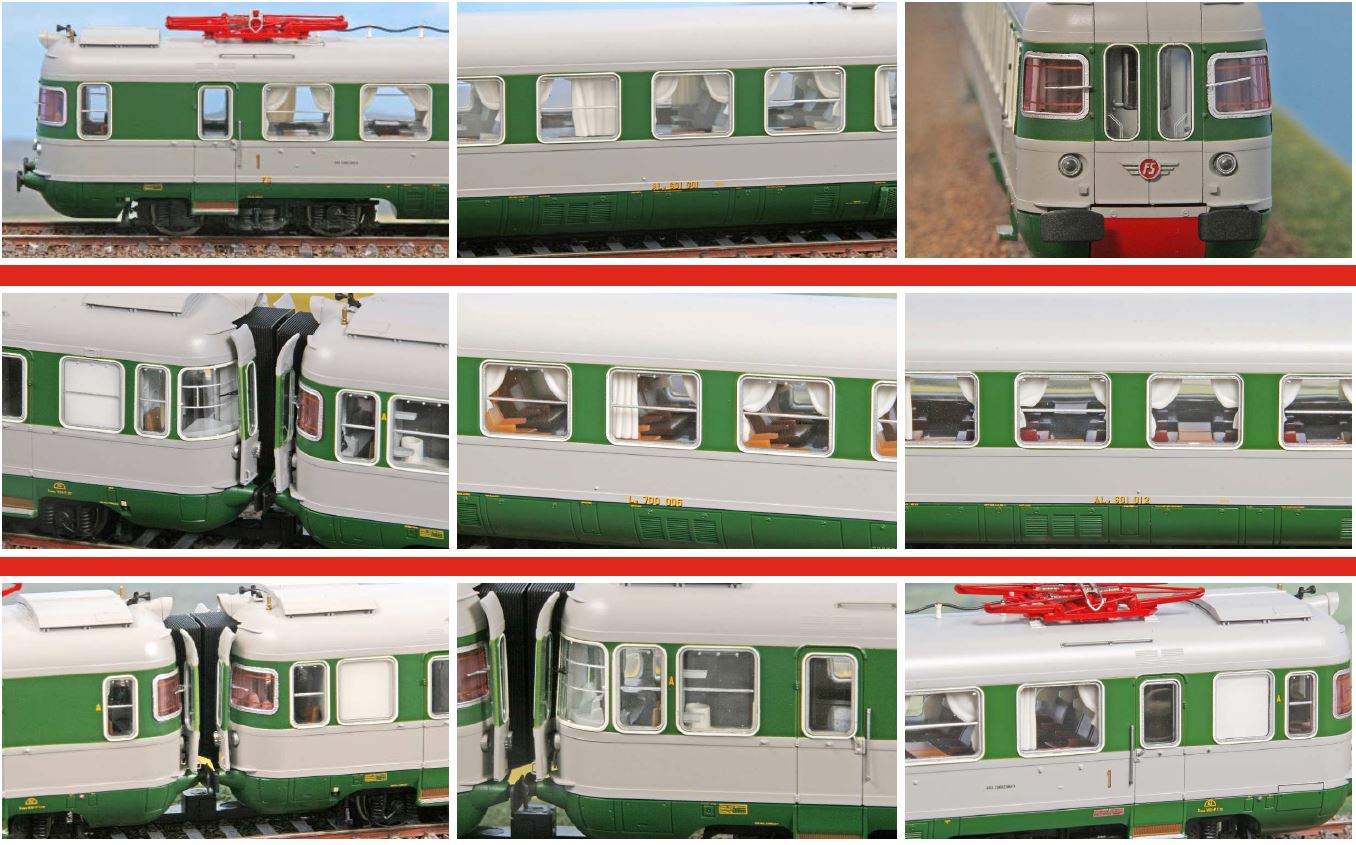 Rapid-Züge, die in den siebziger und achtziger Jahren auf dem FS-Netz im Einsatz waren. Verpackung in limitierter Auflage mit nummerierter Broschüre. Fein detaillierte Modelle mit Innenbeleuchtung.