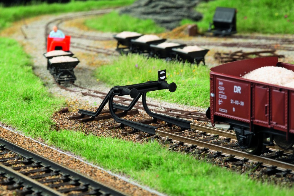 Filigranbausatz. Nachbildung eines Prellbocks aus gebogenen Schienenprofil und Stangenpuffer. Zum Ansetzen an das Gleisende. Die äußerst fein detaillierten Modelle haben angesetzte Puffer und sind je mit einem Signal Sh0, Gleissperrsignaltafel, ausgestattet.