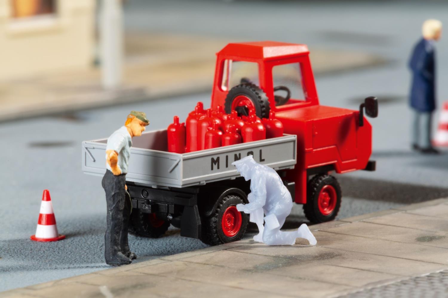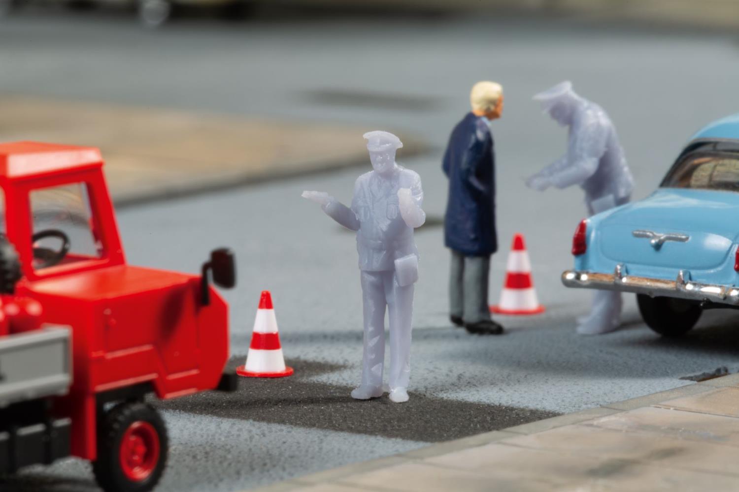 Drei Figuren in Uniform eines Verkehrspolizisten, die leicht selbst bemalt werden können in realistischen Posen und 4 Verkehrsleitkegel zur authentischen Darstellung von Verkehrskontrollen.
