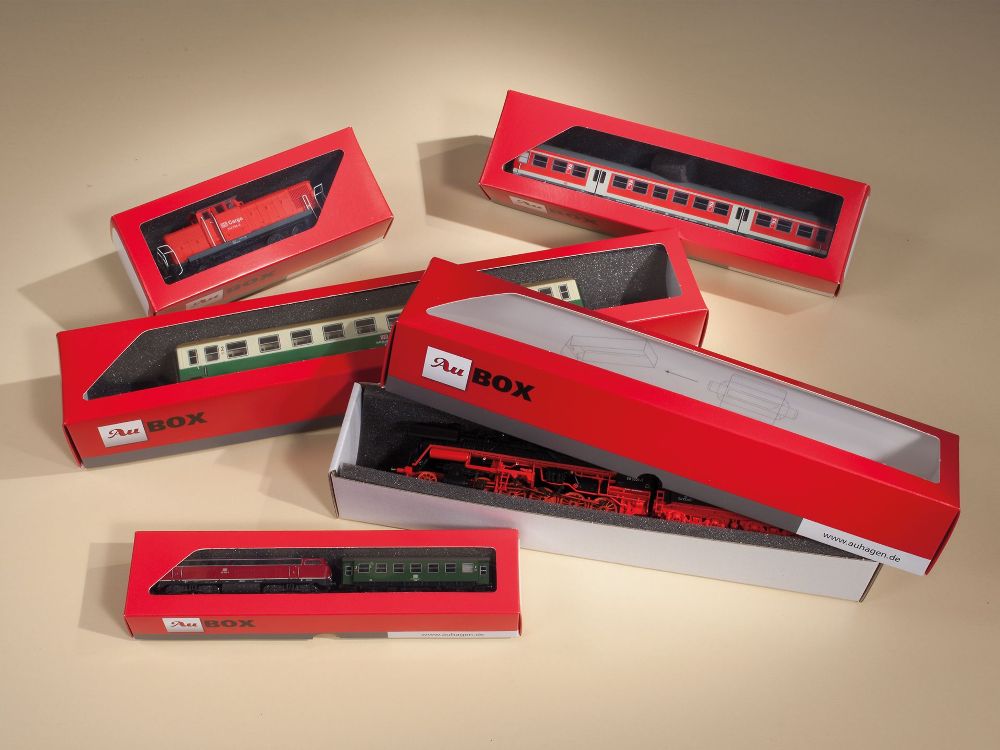 Lager- und Transportboxen für Loks und Wagen, denn mit der Zeit werden die Verpackungen Ihrer Schmuckstücke unansehnlich. Unsere attraktiven Schachteln schaffen Abhilfe. Deckel aus Karton mit Klarsichtfenster. Kasten aus stabiler Mikrowelle. Der Schaumstoffeinsatz schützt Ihre Fahrzeuge vor Beschädigungen. Die Faltschachteln sind leicht aufzustellen. Versand flachliegend. Zum Fixieren von Flachwagen u. a. empfehlen wir unseren Art. 90 300 Schaumstoffzuschnitte.