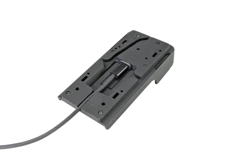 Alternativ kann der Fuß der Docking Station entfernt werden und die Halteplatte kann senkrecht an die Anlage geschraubt werden. Auch in diesem Fall wird der Funkhandregler sicher gehalten und kann natürlich auch bei senkrechter Montage geladen werden.