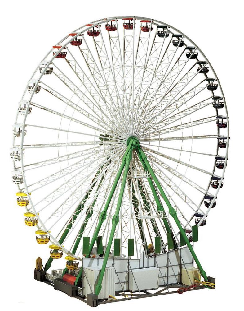 Originalfahrgeschäft der Firma Nauta-Bussink, im Besitz des Schaustellers Barth-Kipp in Bonn. 36 farbige, be-leuchtbare Gondeln, Gesamt-höhe von 520 mm, Jupiter-Schrift-zug, Kassenhaus und vordere Stützstreben lassen sich effektvoll beleuchten. Mit An-triebs-motor (16 V, Wechselspannung). Für die Beleuchtung aller Gondeln des Jupiter-Schriftzuges und der vorderen Stützstreben wird das Riesenrad-Lichtset (Art. 140471) benötigt, das nachträglich montierbar ist.