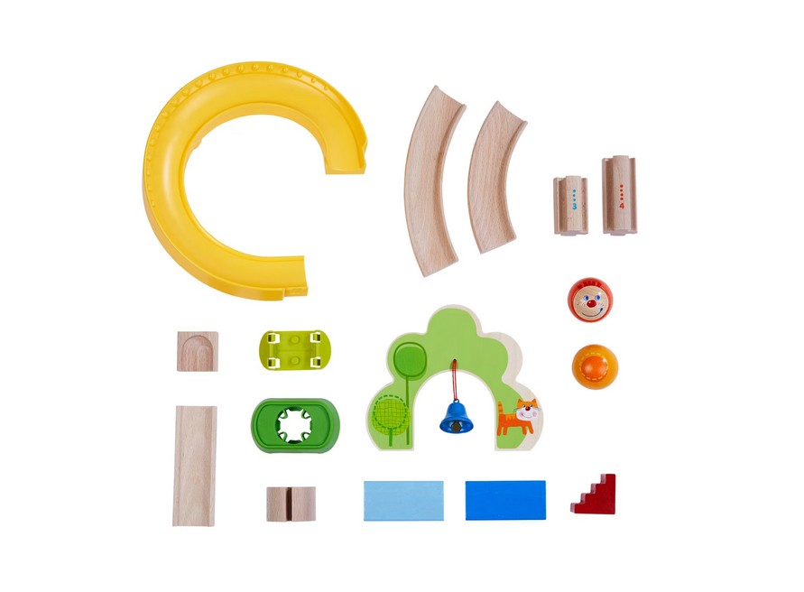 1 Glöckchen-Tor, 1 Kugel-Steilkurve, 5 Kurven, 1 Gerade, 8 Verbindungselemente, 1 Startstein, 2 Säulen, 3 Dominosteine, 2 Treppensteine, 1 Kugel Paul, 1 Kugel.