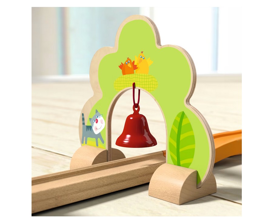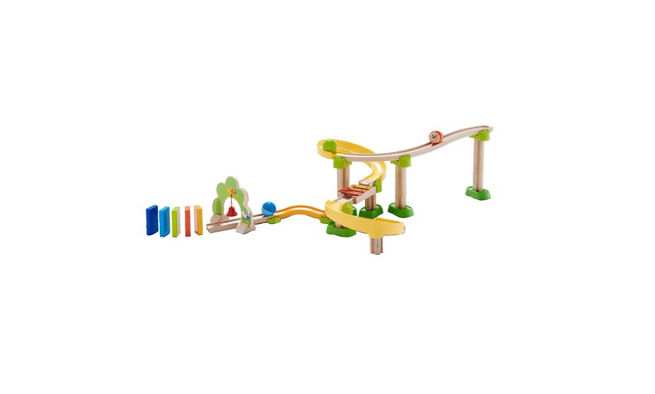 Die Kullerbü-Kugelbahn Sim-Sala-Kling von HABA ist märchenhaft schön und überrascht kleine Baumeister ab 2 Jahren mit mehreren Klangeffekten. Insgesamt 38 Bauteile warten darauf, zu einer fantasievollen Kullerlandschaft verbaut zu werden. Wellenkurve, Kugel-Steilkurven, eine Rampe und mehrere Geraden sorgen bereits beim Aufbau für viel Spaß. Die Säulen verlagern das Kullervergnügen in luftige Höhe und bringen Tempo ins Spiel. Die grünen Verbindungselemente geben der Kullerbü-Kugelbahn Sim-Sala-Kling einen sicheren Stand. Nach dem Aufbau genügt ein Schups, und schon „stürzt“ sich Kugel Paul hinab, um nach einer ersten Kugel-Steilkurve über die Klangtreppe zu flitzen. Nach weiteren Kurven und dem Glöckchen-Tor geht es für Kugel Paul im Zieleinlauf darum, die Dominosteine zu Fall zu bringen.Für alle, die mehr über Kullerbü erfahren wollen, gibt es Vorlese-Geschichten, DIY-Inhalte, Informationen für die Eltern und Spiele in der Themenwelt Kullerbü.