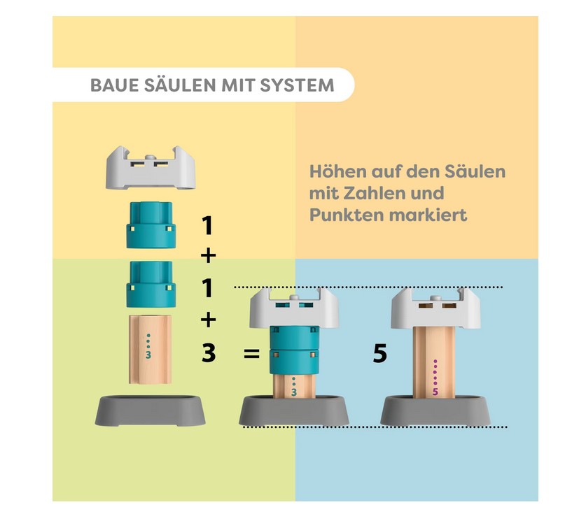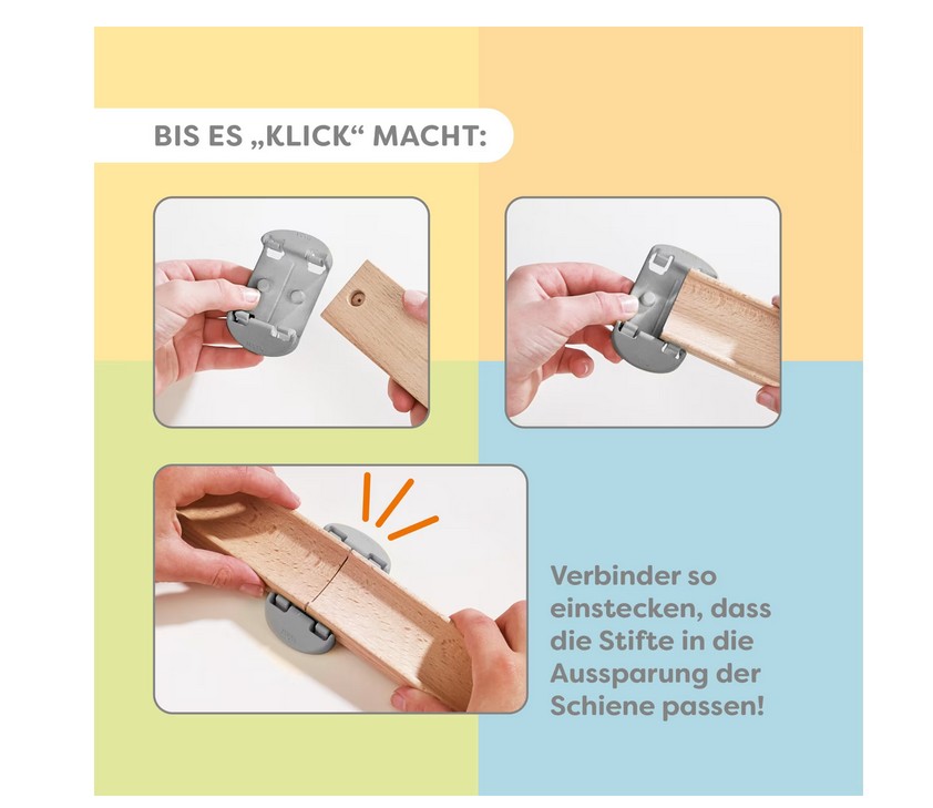 Eine Box für großen Kugelbahn-Bauspaß, auch schon für die ganz Kleinen! 56 Einzelteile und die Box selbst können zu mindestens 10 unterschiedlichen Bahnen zusammengebaut werden – immer angepasst an die aktuellen Entwicklungsschritte des Kindes. Während die Allerkleinsten am liebsten die Kugel erkunden und sie staunend beim Herumkullern beobachten, helfen die Großen schon beim Teile-Heraussuchen und Aufbauen. So wird aus einer einzelnen Geraden mit der Zeit eine komplexe Bahn. Ratterkurven, Klingeltunnel und weitere Elemente sorgen für extra Spielspaß. Tipp: Kreative können ihre Bahnen z.B. mit Büchern als Tunnel oder Bahnverlängerung immer neu gestalten.