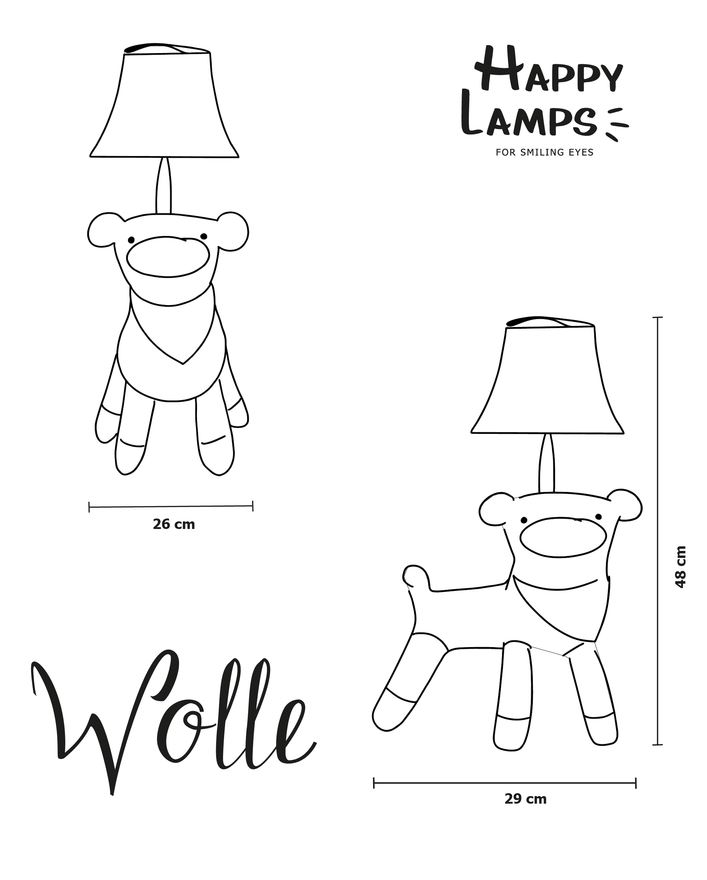 Wolle trägt ein gepunktetes Halstuch, denn er legt großen Wert auf Stil. Sein ganzer Körper ist weich und flauschig, genauso wie sein Lampenschirm und seine Füße. Das Bommelschwänzchen rundet sein süßes Erscheinungsbild ab. Durch seinen liebenswerten Blick wird Wolle im Handumdrehen dein Herz erobern.
