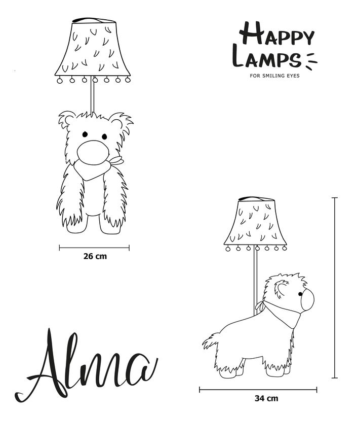 Alma hebt sich mit Ihrem einzigartigen flauschigen Stoff von allen Lampen ab. Durch ihre beige Farbe passt sie sich super an alle Räumlichkeiten an. Ihr flauschiges Fell in Verbindung mit ihren Knopfaugen und dem süßen Halstuch zaubert Alma allen Menschen, egal ob groß oder klein, ein Lächeln aufs Gesicht. Zudem erzeugt der einzigartige Lampenschirm eine ganz besonders gemütliche Lichtfarbe.
