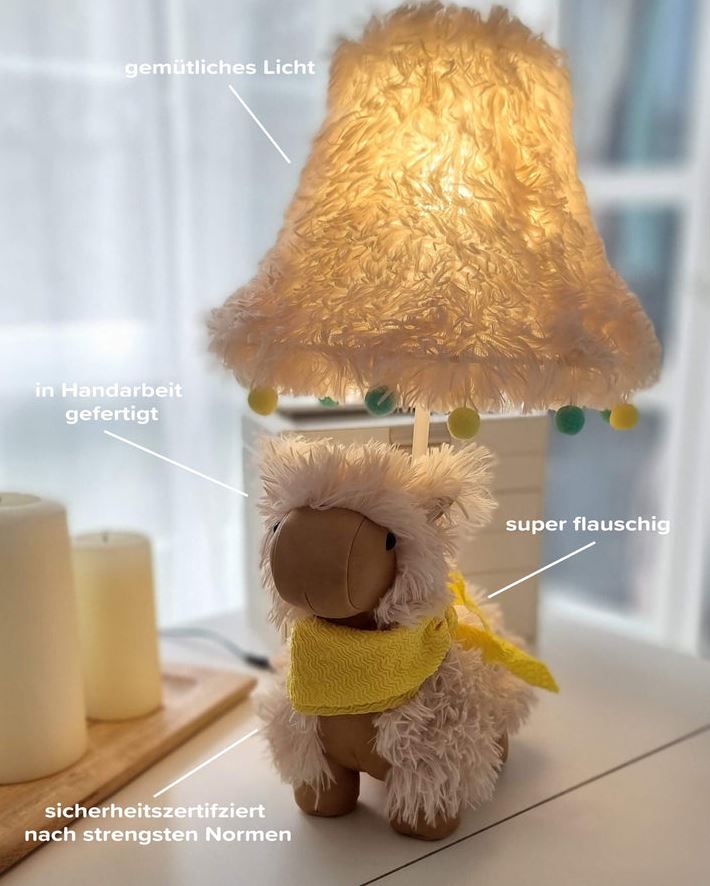 Alpakas sind süß und flauschig, so auch Alma. Mit Ihrem kuscheligen Fell und den süßen Bommeln am Lampenschirm ist Sie einfach ein Hingucker. Mit ihrem unvergleichbar flauschigen Auftreten zaubert Sie dir immer wieder ein Lächeln ins Gesicht. Alpakas sind sehr friedliche und sanfte Wesen, die es gerne haben in einer Gruppe zu leben. So wird es Alma lieben dir bei all deinen täglichen Aufgaben zu Hause oder auch im Büro nicht von der Seite zu weichen.