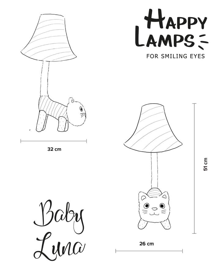 Mit ihren gepunkteten kleinen Beinchen, dem gestreiften Körper und Lampenschirm ist Luna ein richtiger Hingucker im Raum. Ihr Wollgesicht mit den gestickten Augen und dem Mund lässt sie unglaublich freundlich, niedlich und sympathisch wirken. Typisch für Katzen, die ihren Schwanz steil nach oben richten, ist Luna gut gelaunt und immer froh, dich zu sehen. Sie trägt darauf auch stolz ihren Lampenschirm und wartet, bis sie bei dir zuhause zum Einsatz kommen darf.