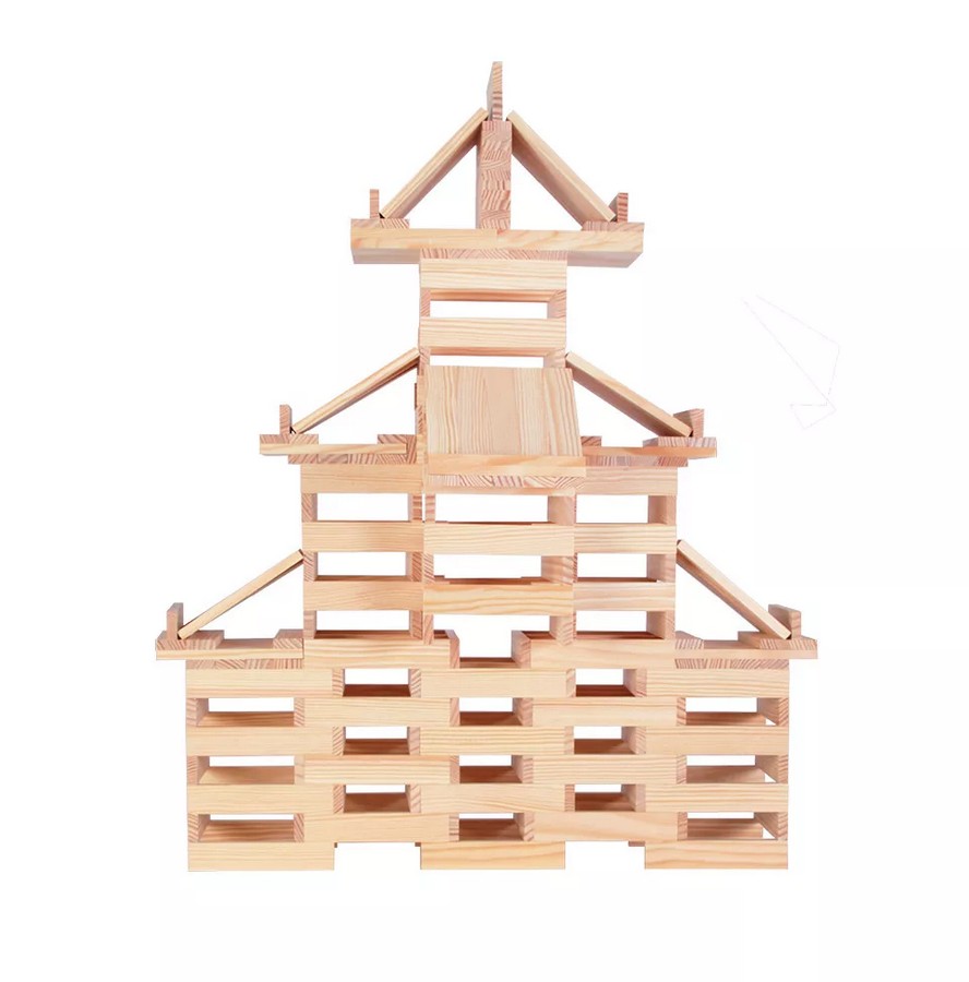 Die Holzplättchen werden einfach nur aufeinandergelegt, ohne Klebe oder andere Befestigungen und so wird nach Lust und Laune gebaut…