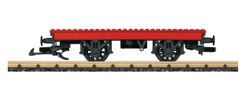 Modell eines zweiachsigen Flachwagens. Der Wagenboden ist mit den üblichen Klemmnoppen versehen, sodass verschiedenste Aufbauten mit Bausteinen anderer namhafter Hersteller möglich sind. Länge über Puffer 26 cm.