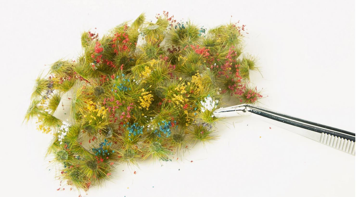 Unsere Blumen sind eine wunderschöne kleine Innovation: In einem Bett aus 4 mm langen grünen Fasern befinden sich einige 9 mm lange Fasern, die farbig beflockt sind. So lassen sich wunderbar natürlich wirkende Blumen im Modell nachbilden. Das Set enthält insgesamt 250 Blumen in jeweils fünf verschiedenen Farben.