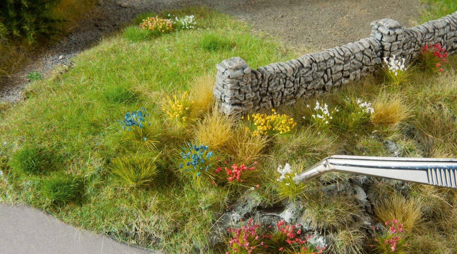 Die Blumen werden der Schachtel entnommen und mit einem Tropfen Klebstoff in der Modell-Landschaft fixiert. Wir empfehlen die Verwendung von NOCH Landschaftsbau-Kleber, aber auch Heißkleber oder Alleskleber sind bestens geeignet.