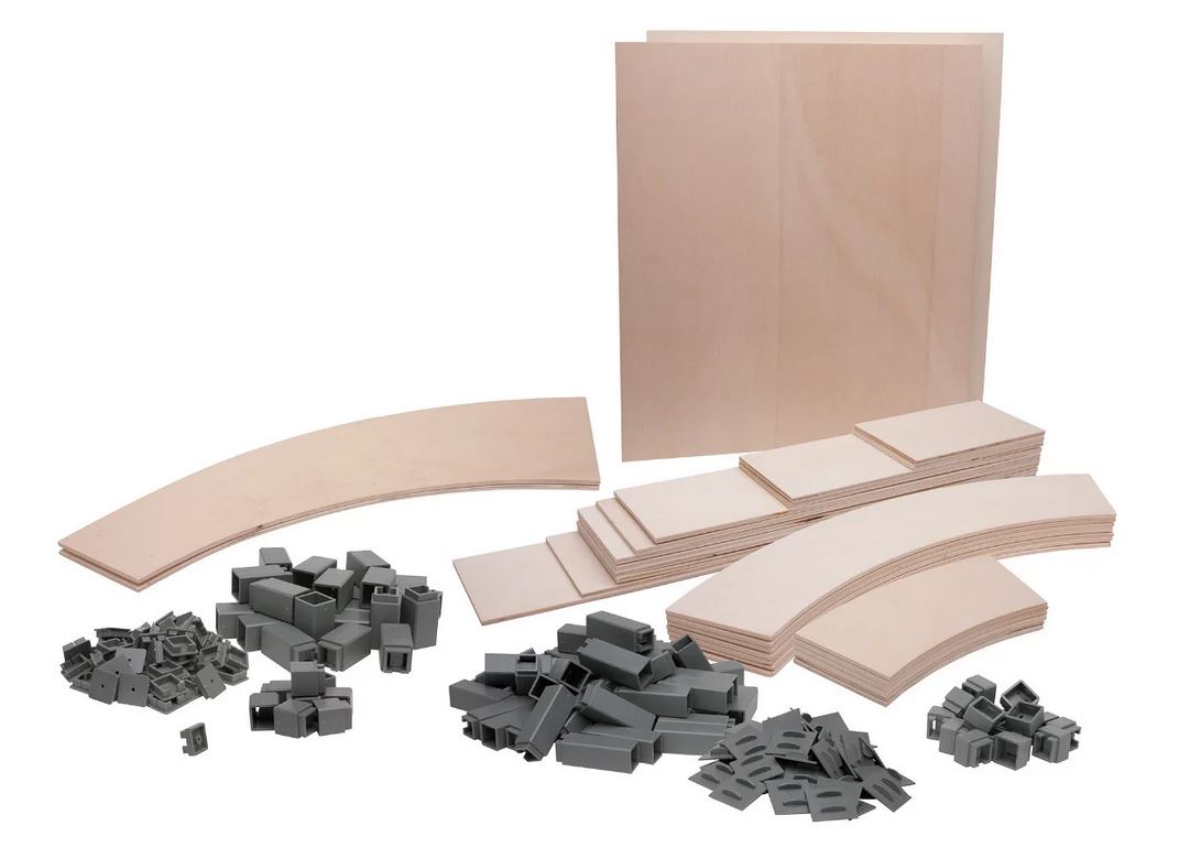 Was wird noch benötigt? Werkzeug wie Säge, Schleifpapier, Schraubenzieher sowie Klebstoff ist notwendig, wir empfehlen hier Heißkleber. Außerdem können kleine Kartonstücke zur Stabilisierung der Trassen verklebt werden.