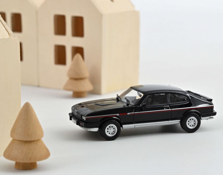 Feine Details wie die seitliche Streifen-Bedruckung, die abgesetzten Schürzen oder die zeitgenössischen Leichtmetallfelgen zeichnen die in ebenso sportlichem wie zurückhaltendem schwarz lackierte Norev-Miniatur des Ford Capri aus.