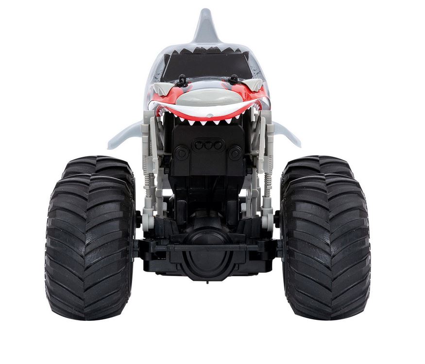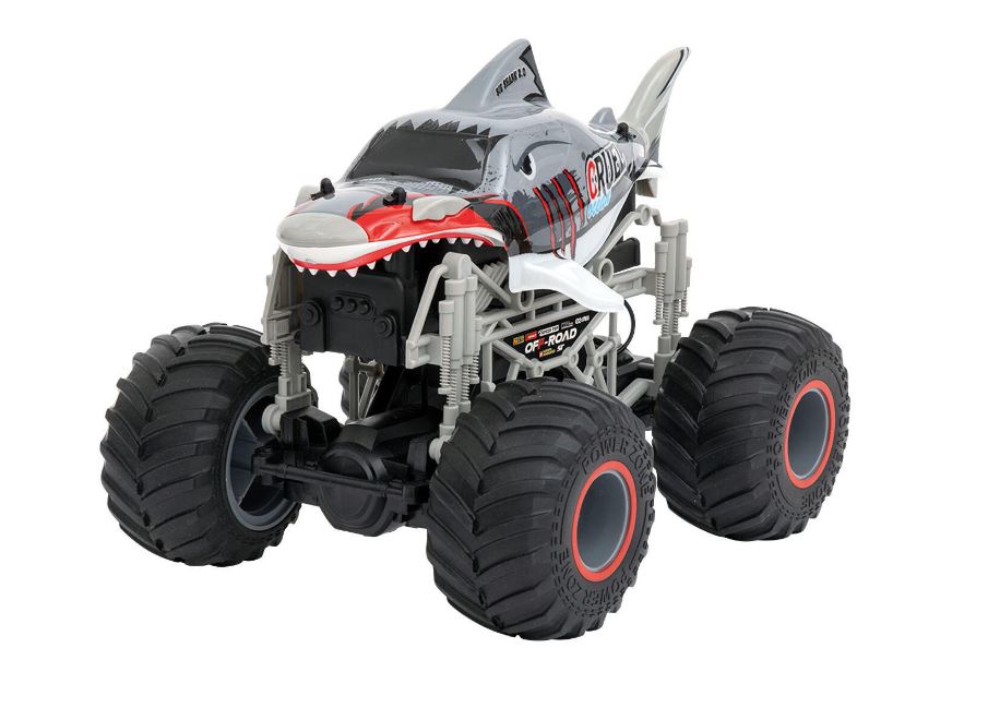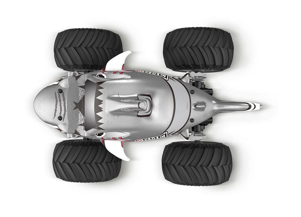 RC Monster Truck im Maßstab 1:16. Mit bulligen Monster Truck Reifen und außergewöhnlichem Hai Design. Mit 2.4 GHz Fernsteuerung, für Rechts- und Linkshänder geeignet. Inkl. wechselbarem Li-Ion Akku und USB-Ladegerät für 15 min Fahrzeit. Geschwindigkeit: 15 km/h. Modell-Länge: 325 mm. Ab 8 Jahren.