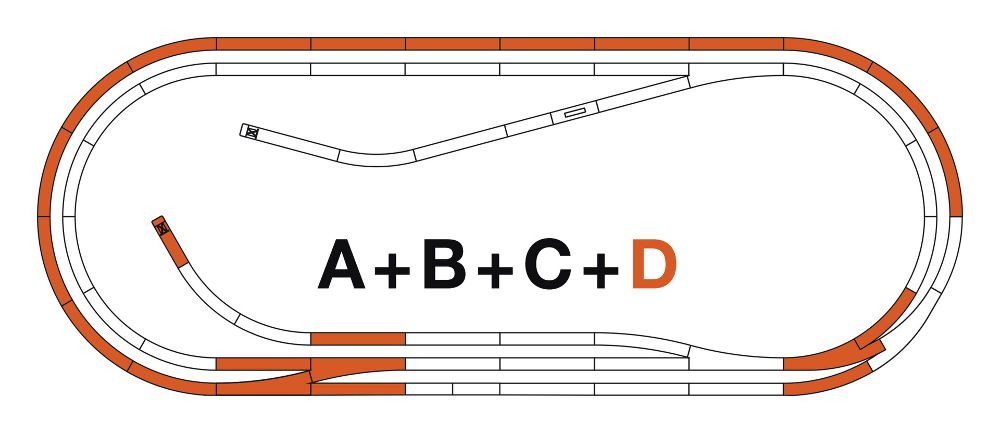 Die Mindestkonfiguration Gleisset A ist in allen Start Sets mit ROCO LINE-Bettungsgleis enthalten und nicht als Einzelset erhältlich. Alle weiteren Gleissets bauen auf dieser Zusammenstellung auf. (A+B+C+D)
