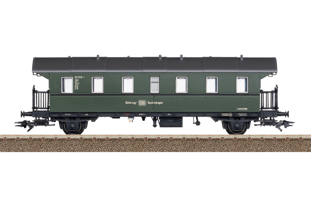 Vorbild: 2-achsiger Güterzug-Gepäckwagen Bauart Pwghs, ehemalige Donnerbüchse Bi, 2. Klasse, der Deutschen Bundesbahn (DB). Chromoxidgrüne Grundfarbgebung. Betriebszustand ab 1964.