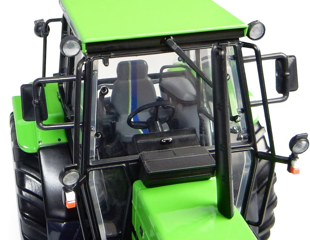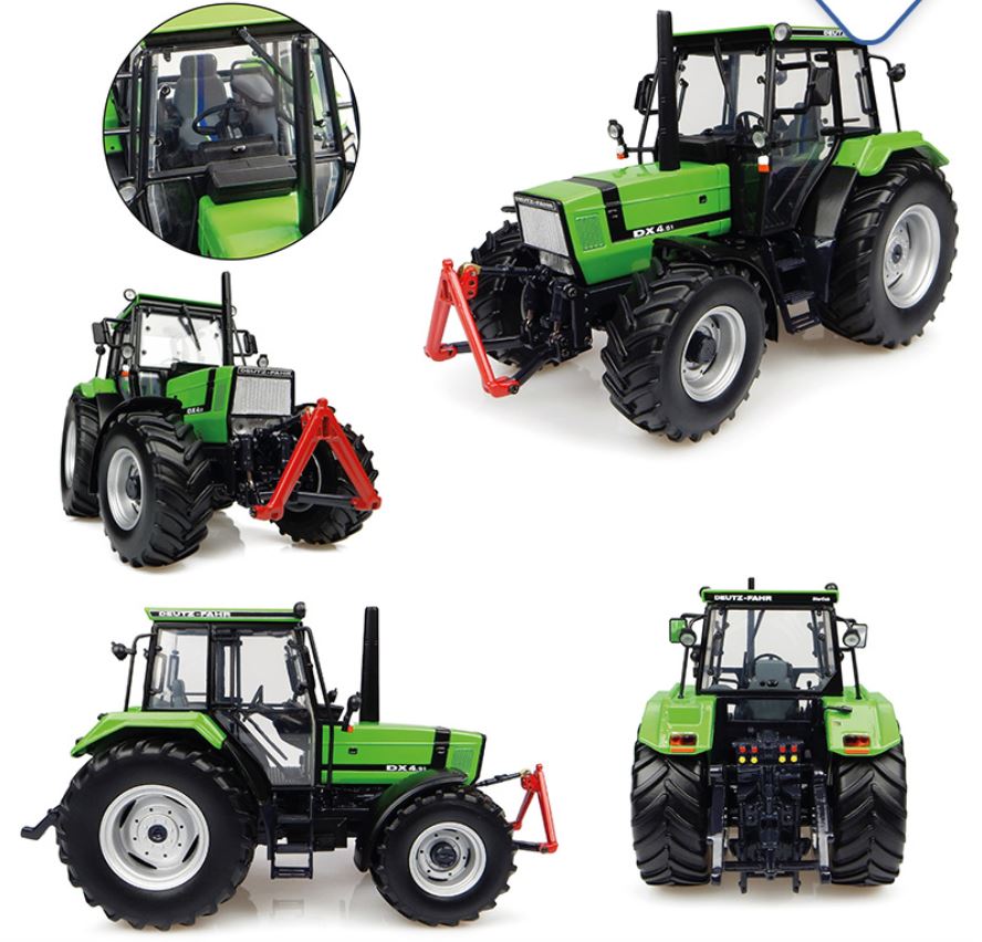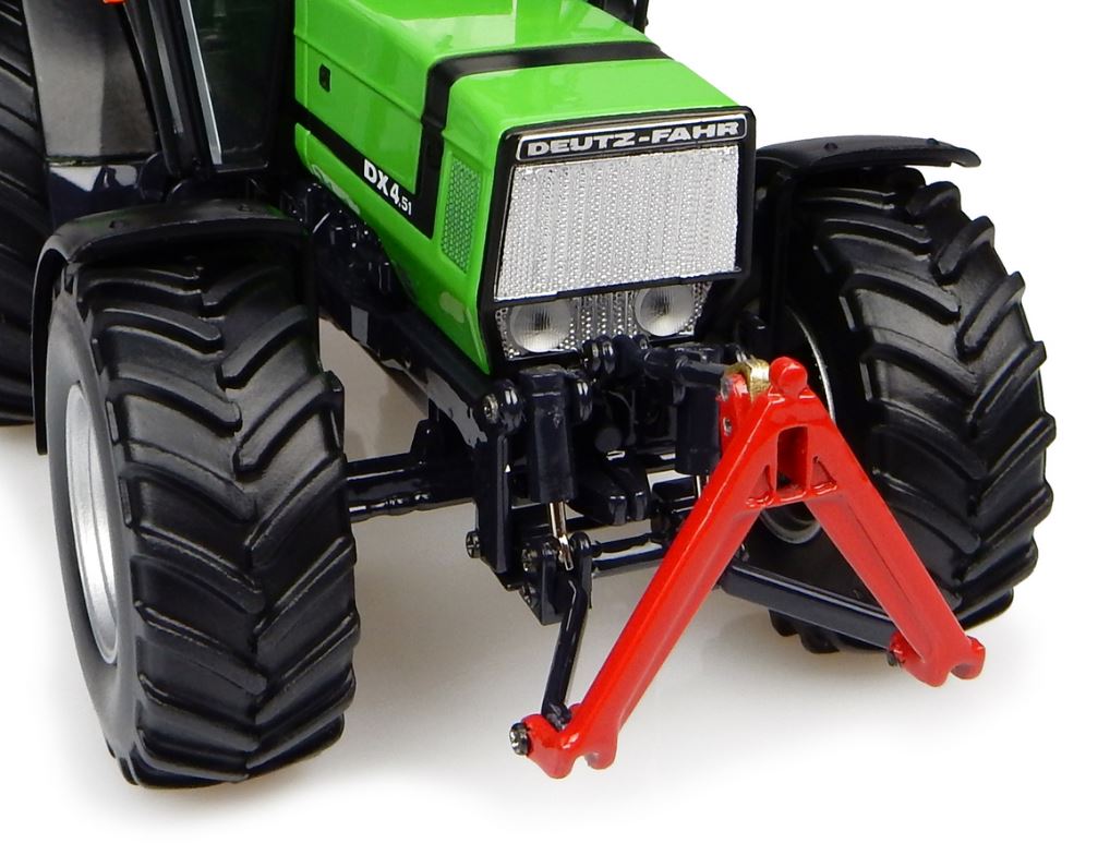 Sammlerminiatur aus Metall des Traktors Deutz Fahr DX 4.51 aus dem Jahr 1989 mit Frontkraftheber. Sehr detaillierte Replik im Maßstab 1:32, hergestellt von Universal Hobbies im Jahr 2016.
