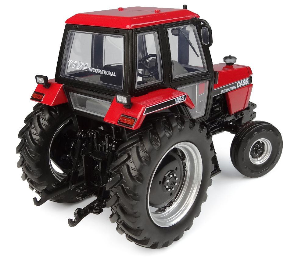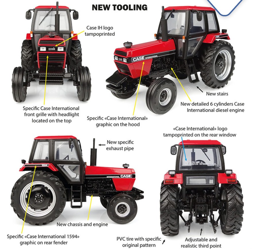 Der Traktor Case International 1594 besteht aus 127 Teilen und umfasst 154 Tampondruckvorgänge. Es handelt sich um ein neues Werkzeug, das einen neuen, sehr detaillierten 6-Zylinder-Dieselmotor, ein neues Fahrgestell, eine neue Trittstufe, einen neuen speziellen Auspuff und einen neuen Kühlergrill mit den Positionsleuchten oben am Kühlergrill umfasst. Es handelt sich um eine Version mit Zweiradantrieb. Die Reifen sind aus weichem PVC mit einem originalgetreuen Reifenprofil. Die hintere Anhängerkupplung ist realistisch und verstellbar. Das Case-Logo an der Vorderseite des Kühlergrills ist im Tampondruckverfahren aufgebracht, ebenso wie die Aufschriften „Case International” und „1594” an der Seite der Motorhaube und am hinteren Kotflügel. Der Innenraum der Kabine ist sehr detailliert: Lenkrad, Armaturenbrett, Hebel usw. Dieses Metallmodell im Maßstab 1:32 ist eine originalgetreue Nachbildung des Traktors Case International 1594.