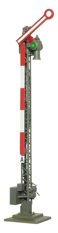 Mit filigranem Gittermast aus Messing in originalgetreuer Lackierung. Bedruckte Signalflügel. Unterflur-Kompaktantrieb mit integrierter Zugbeeinflussung. Wartungsfrei dank LED-Beleuchtung. Signalbilder Hp0 und Hp1. Höhe: 7,8 cm.