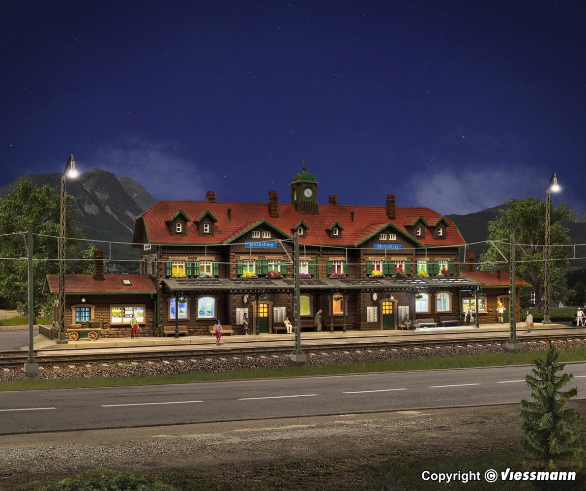 Der Bahnhof Moritzburg ist ein stattlicher Bahnhof. Die vielen Details machen ihn zum Blickfang auf Ihrer Anlage. Hier herrscht geschäftiges Kommen und Gehen. Maße: L 52,8 x B 15,5 x H 18 cm