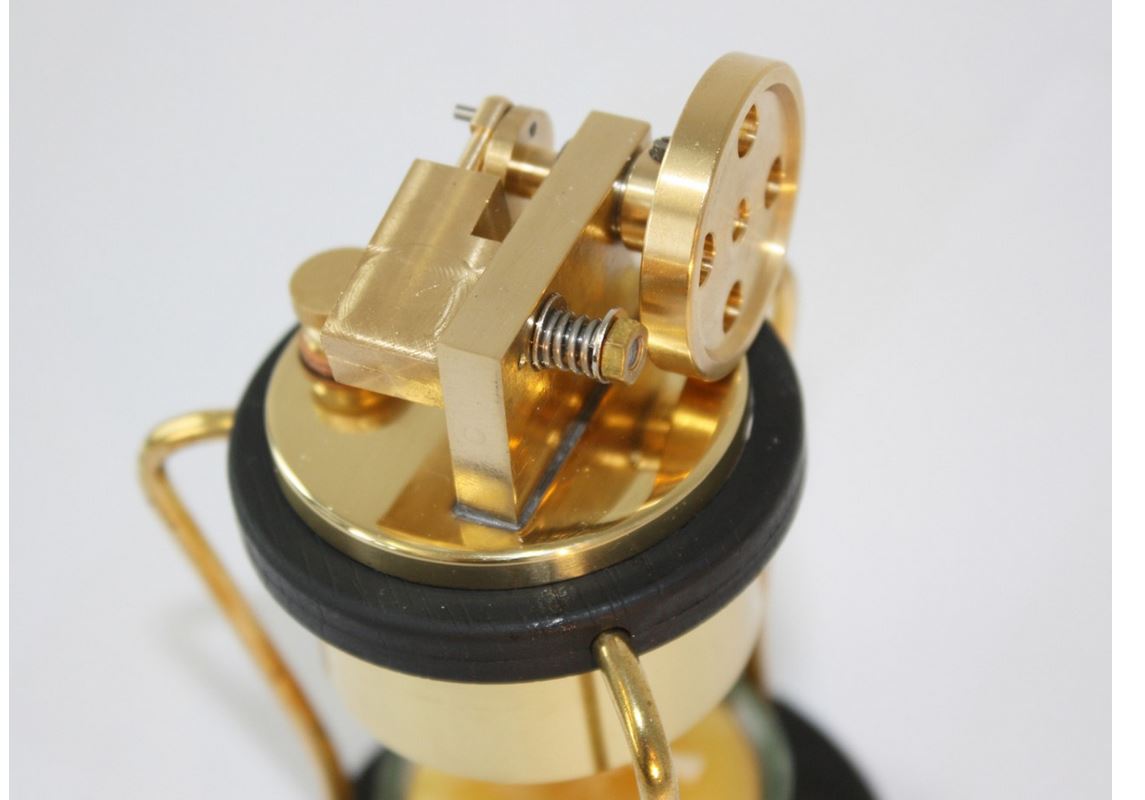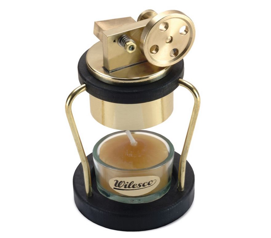 An dieser Schönheit werden viele nicht vorbeikommen. Mit einem speziellen Bienenwachs-Teelicht beheizt, schnurrt der filigrane Schwingzylinder auf und ab und treibt das glitzernde Schwungrad flott an. Es ist eine Freude, diesem mechanischen Meisterstück zuzusehen.