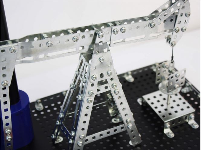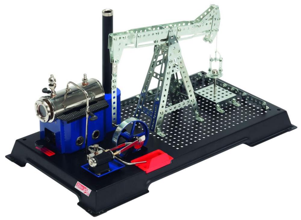 Ergänzt wird das Modell D11 durch ein über 300-teiliges Set aus Bauteilen der beliebten Tronico-Metallbaukästen. Aus diesem Set lässt sich die Nachbildung einer Ölpumpe zaubern. Verbunden mit dem Schwungrad der Dampfmaschine beginnt die Ölpumpe sich in Bewegung zu setzen und bohrt unermüdlich nach Öl.