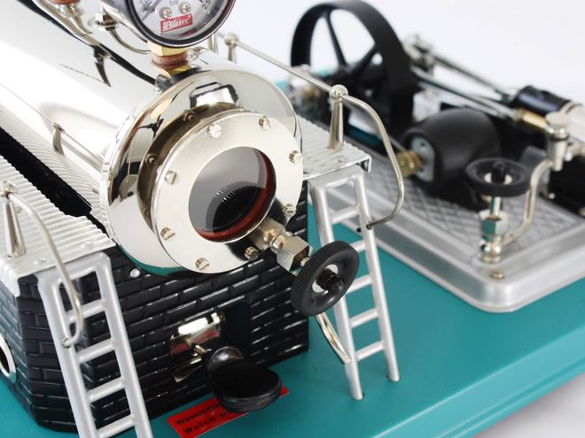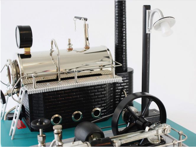Farblich stellt diese Modellvariante eine absolute Neuerung dar: Die wasserblaue Grundplatte wurde mit schwarzem Kesselgehäuse und silberfarbener Aggregatplatte kombiniert. Das Schwungrad ist schwarz lackiert.