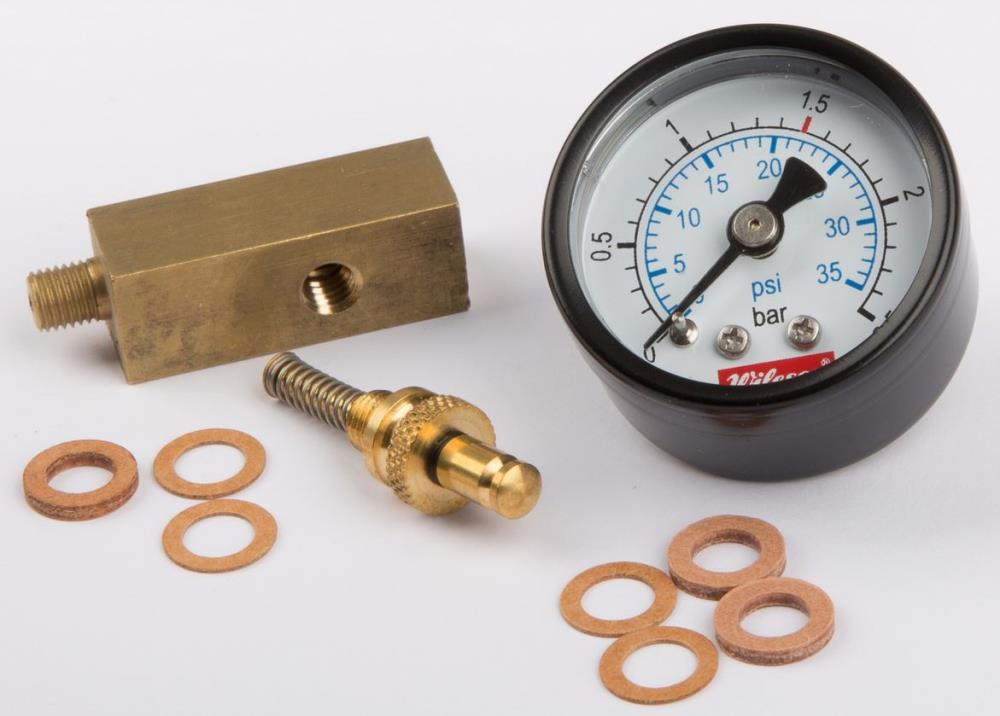 Manometersockel Messing, 12 x 12 mm Gewindestutzen M6 x 0,75 mit Federsicherheitsventil und Manometer D15, D21, D320.