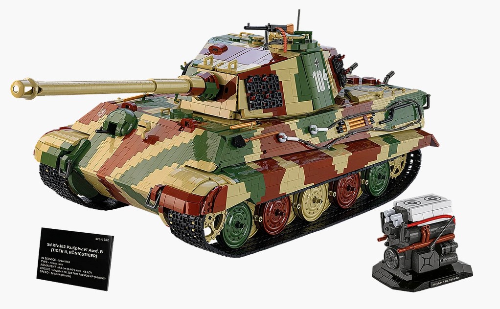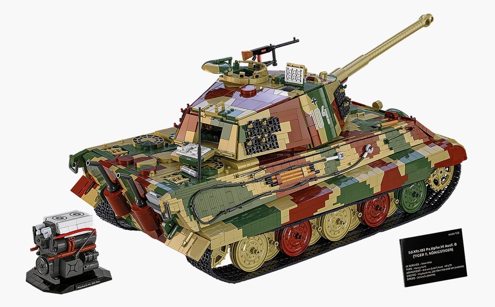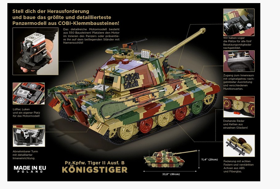 Über 11.000 Teile! – Dies ist nicht nur das größte Tiger-Modell, sondern auch der komplexeste Bausatz, den COBI je hergestellt hat. Die Struktur wurde so konzipiert, dass nicht nur das Äußere, sondern auch die inneren Mechanismen und die Struktur des Fahrzeugs nachgebildet werden. Dies ist eine Bauherausforderung für die erfahrensten Baumeister und bietet die Zufriedenheit hochprofessioneller Modelle! Unglaublicher Realismus – Speziell entwickelte Konstruktionselemente, eine für die späten Tiger-II-Modelle typische dreifarbige Tarnung, ein realistisches Farbschema basierend auf dem Museumsfahrzeug Tiger 104 sowie perfekt reproduzierte Proportionen und Texturen lassen das Modell aus jedem Blickwinkel wie eine Miniaturversion eines echten Panzers aussehen.