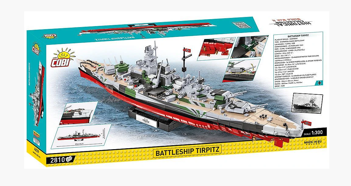 Das von der Firma COBI erstellte Schiffsmodell wurde im Maßstab 1:300 produziert. Es hat fast 2.810 Elemente und ist 87 cm lang. Dank der Verwendung der neuesten verfügbaren Elemente und fortschrittlicher Konstruktionstechniken spiegelt das Modell die Proportionen des historischen Schiffes originalgetreu wider und behält alle wesentlichen Elemente bei, einschließlich der ursprünglichen, sehr charakteristischen Tarnung. Es verfügt über zahlreiche bewegliche Teile wie Propeller, Ruder, drehbare Türme und Kanonenrohre, die angehoben und abgesenkt werden können. Das Set enthält auch einen sehr stabilen und ästhetischen schwarzen Ständer mit einer Platte, auf der der Name des Schiffes aufgedruckt ist. Da es sich um ein großes und recht komplexes Modell handelt, empfehlen wir es vor allem erfahrenen Sammlern und älteren, erfahrenen Ziegelfans. Es muss nicht geklebt oder bemalt werden, da sein gesamter Körper und seine Elemente aus COBI-Bausteinen bestehen.