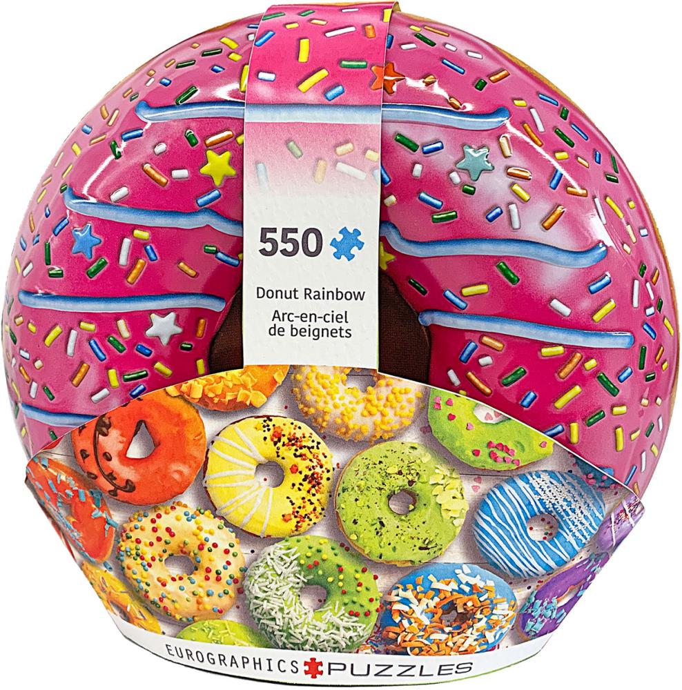 Eurographics Donut Rainbow Puzzle Dose, 550-teiliges Puzzle mit Poster. Fertige Puzzle Größe: 48 x 33 cm. Hergestellt aus recyceltem Karton und bedruckt mit Tinte auf pflanzlicher Basis. Dieses hochwertige Puzzle wird alle gleichzeitig begeistern und erziehen.