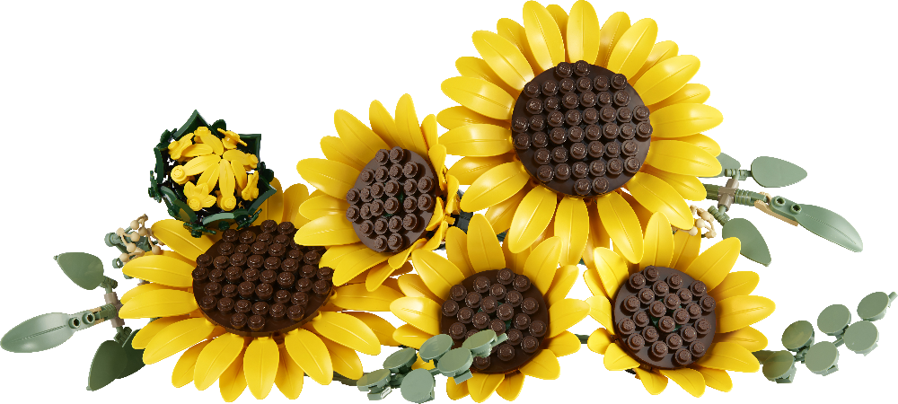 LEGO® SONNENBLUMEN: Der Strauß besteht aus 6 Sonnenblumen: 1 Sonnenblumenknospe, 3 Sonnenblumen, die gerade erst aufgehen, und 2 großen voll geöffneten Sonnenblumen