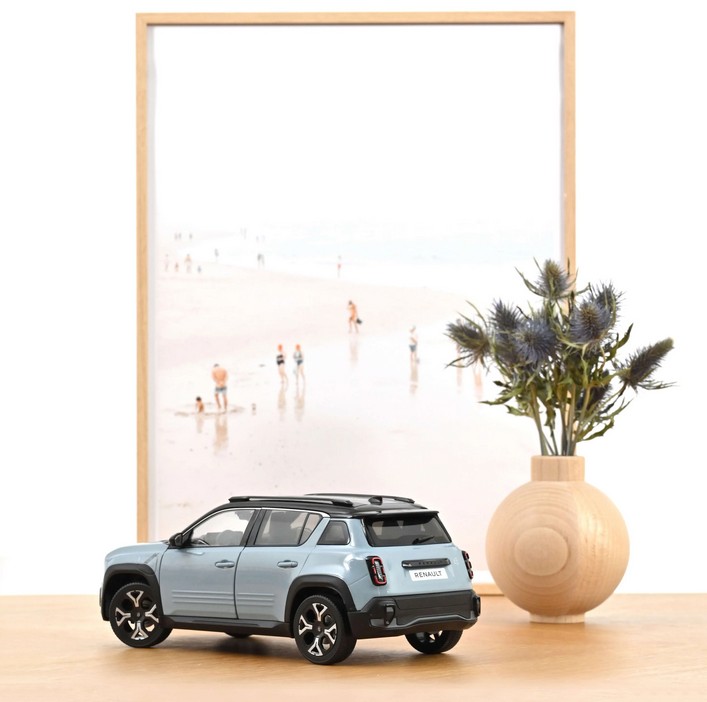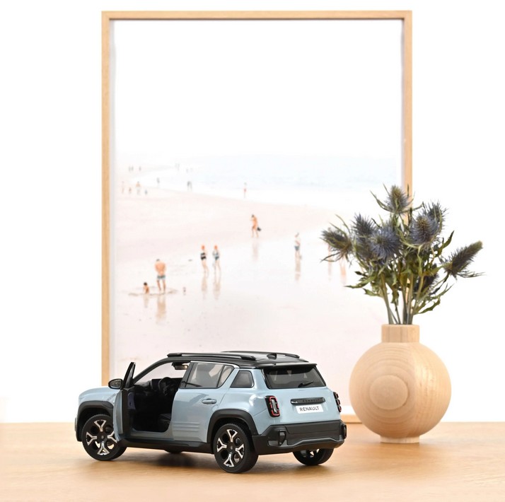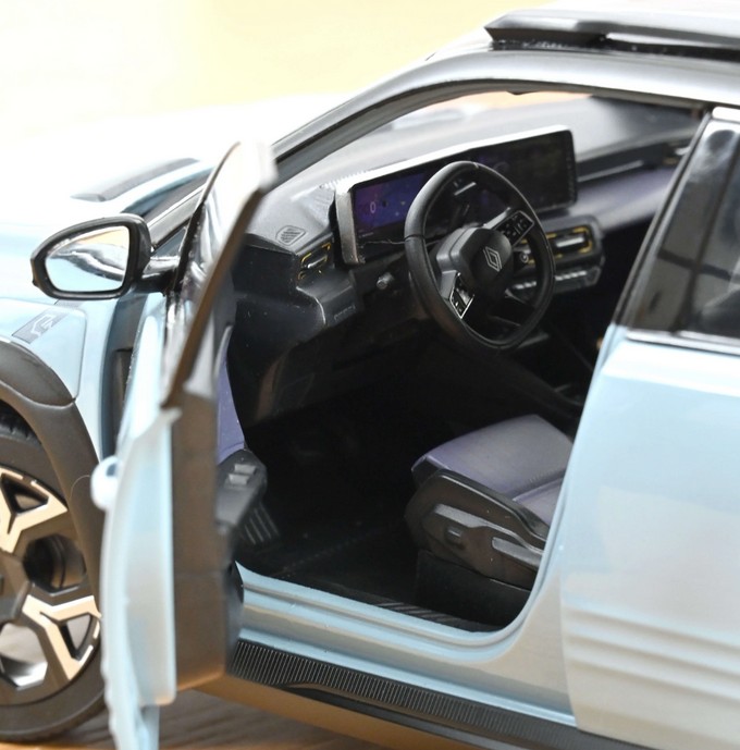 Dieses Miniaturmodell wird in Blau mit schwarzem Dach in der Ausstattungsvariante Techno angeboten. Die beiden Vordertüren ermöglichen einen Blick ins Innere, insbesondere auf die Polsterung aus 100 % recyceltem Jeansstoff.