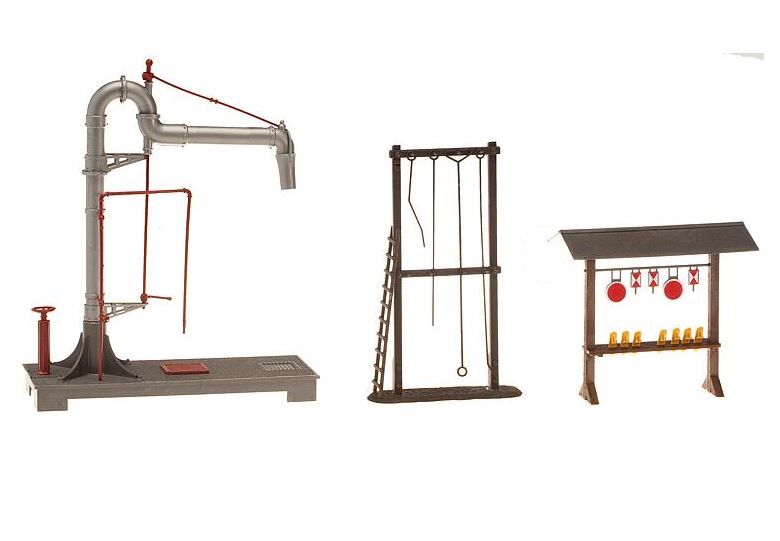 Zubehör-Set für den Bahnbereich. Bestehend aus: - Signaltafeln mit Hemmschuhständer für den Rangierbereich - einem Schürhakengestell zum Reinigen der Dampfloks - einem Wasserkran mit schwenkbarem Gelenkausleger auf einer Sockelplatte