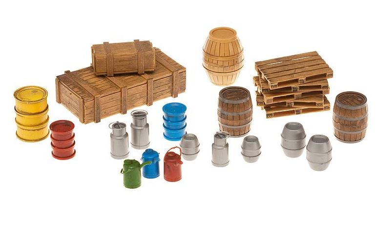 Viele verschiedene Ladegüter in einem Set: 4 Bier- und 3 Holzfässer, 3 große und 1 kleine Milchkanne, 3 kleine und 3 große Ölfässer, 2 Holzkisten und 5 Mehrwegpaletten.