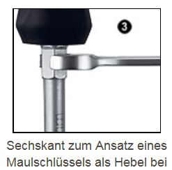 Mit Sechskant zum Ansatz eines Maulschlüssels als Hebel.