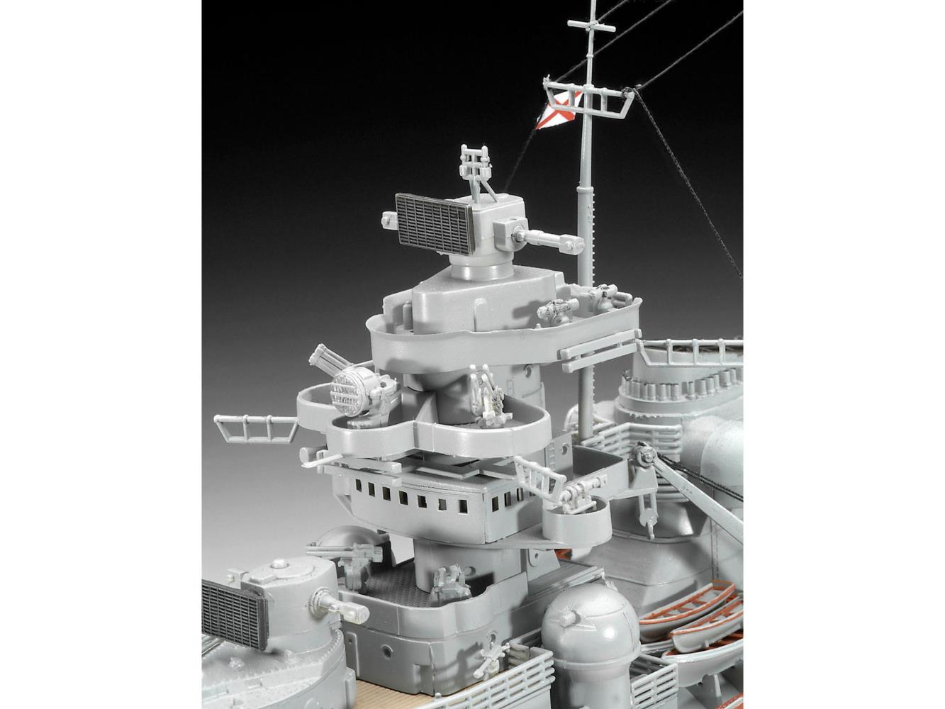 Die Bismarck war zu ihrer Zeit mit 42.343 t das (neben der Hood) größte und modernste Schlachtschiff der Welt. Am 24. Mai 1941 versenkte sie in einem Seegefecht zusammen mit dem Schweren Kreuzer Prinz Eugen an der Packeisgrenze vor Grönland mit der 5. Salve ihrer 38-cm-Geschütze den größten britischen Schlachtkreuzer, die Hood, durch Volltreffer. Am 14. Februar 1940 bei Blohm & Voss in Hamburg vom Stapel gelaufen war sie gemeinsam mit der baugleichen Tirpitz das modernste Schiff und das Prestigeobjekt der deutschen Kriegsmarine. Bei 251 m Länge reichte die Mastspitze bis 52 m über der Wasserfläche. Insgesamt wurden 17.450 t Stahl als Panzerschutz verbaut. Die neu konstruierte schwere Artillerie verschoss 800 kg schwere Projektile bis zu einer Entfernung von 34,2 km, wobei eine 350-mm-Panzerung bis auf 21 km durchschlagen werden konnte. Während die Prinz Eugen beim Gefecht am 24. Mai keinen Treffer erhielt, nahm die am Bug beschädigte Bismarck Kurs auf einen französischen Hafen. Bei der anschließenden Verfolgung durch britische Schiffe und Flugzeuge wurde das Schiff nach einem Torpedotreffer in die Ruderanlage am 27. Mai 1941 von zahlenmäßig überlegenen Kräften der Home Fleet kampfunfähig geschossen und versank im Atlantik rund 800 km vor der französischen Küste. Von 2.092 Mann an Bord überlebten 115. - Vier detaillierte 38 cm Geschütztürme - Zwölf 15 cm Geschütze - Sechzehn 10,5 cm Flak-Geschütze - Suchscheinwerfer mit Klarsichtteilen - Zehn Rettungsboote - Zwei Arado 196 Seeflugzeuge mit Glaskanzel - Zwei detaillierte Kräne - Displayständer - Tarnanleitung und Abziehbilder für zwei Einsatzzeiträume
