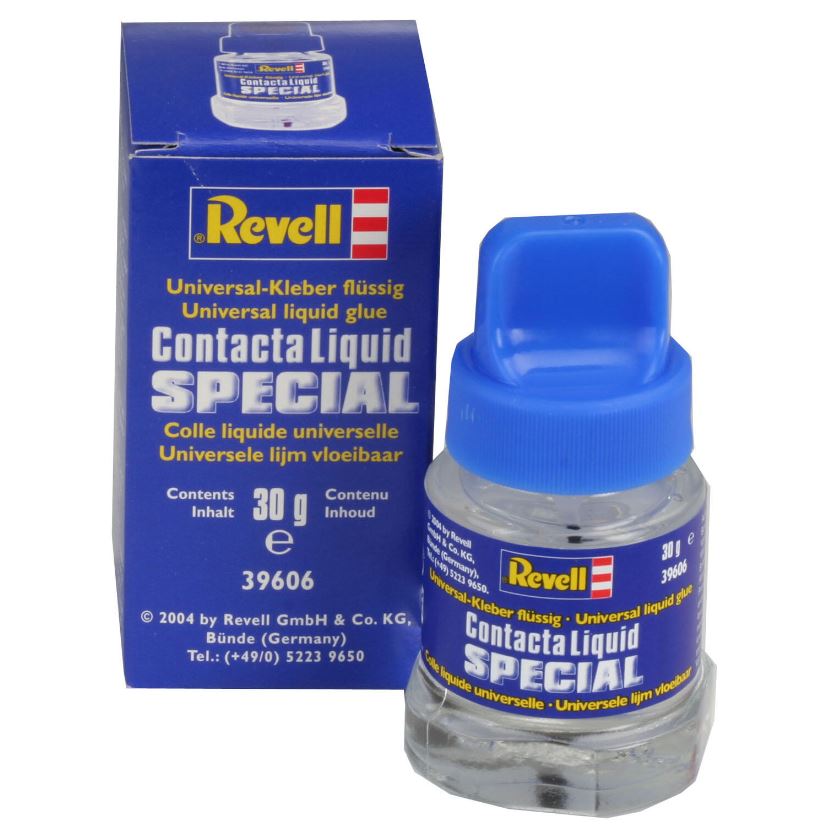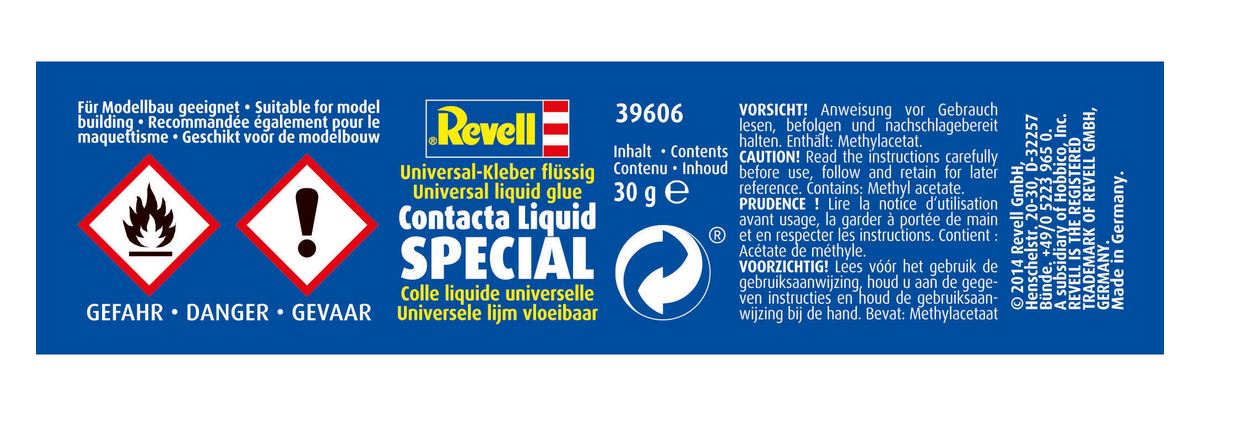 Revell Contacta Liquid Special ist ein spezieller Chrom-Klebstoff, der aber sehr universell eingesetzt werden kann. Da die Chromschicht den Verschweißungs-Effekt verhindert, kratzt man entweder die Chromschicht weg oder - wesentlich eleganter - nimmt den Spezial-Kleber von Revell. Auch Klarsichtteile wie Fenster oder Cockpit-Hauben lassen sich damit gut montieren, weil diese durchsichtigen Teile dadurch nicht angegriffen werden. Revell Contacta Special verklebt auch Metall, Holz, Papier, Pappe, Glas und Textilien sowohl mit Kunststoff als auch untereinander.