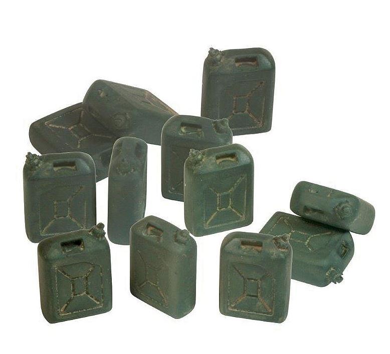 12 Benzinkanister für bis zu 20 Liter, wie sie von den Israelis genutzt werden. Nicht koloriert. Ideal für den Dioramenbau. Maße: