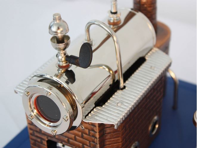 Die beliebteste stationäre Dampfmaschine im WILESCO-Programm ist nun auch mit einem originalgetreu dampfenden Kamin ausgestattet. Das Kondensat wird vom Zylinder aus in den hinteren Bereich des Kesselhauses in eine Kondenswasserschale geleitet. Dies hat dann den reizvollen Effekt, dass der Kamin raucht. Jetzt verhilft die Optik jedem Dampfliebhaber zu noch mehr Echtdampfspaß.