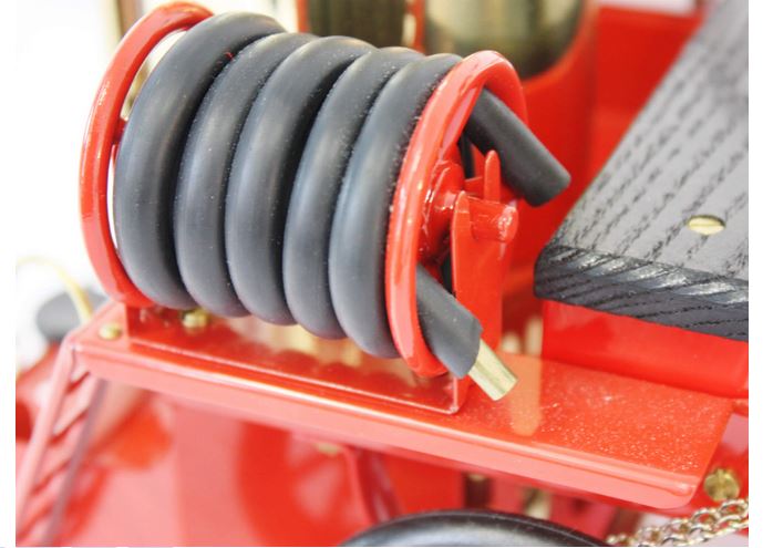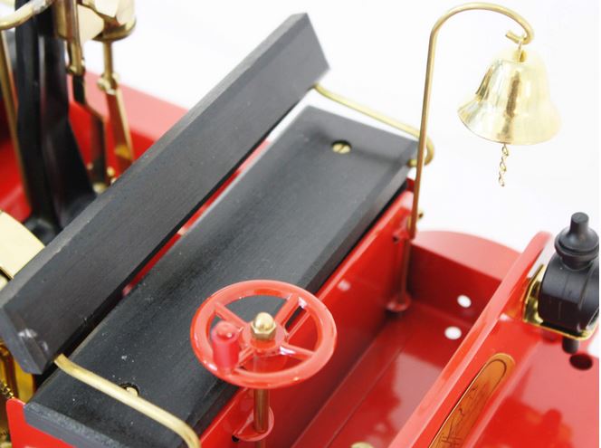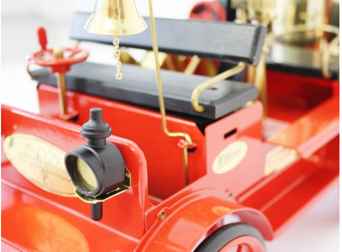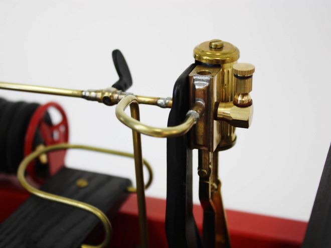 Genau wie bei seinem Vorbild hat das Dampfmobil einen stehenden Kessel und Antrieb. Mit dem Kupplungshebel kann die selbstansaugende Wasserpumpe in Betrieb gesetzt werden. Unter der vorderen Sitzbank des Feuerwehrautos befindet sich ein Vorratsbehälter für Wasser. Dieser hat eine direkte Schlauchverbindung zur Wasserpumpe. Die Bänke sind aus Holz, der Kessel selbst und alle Rohrleitungen sind aus Messing.